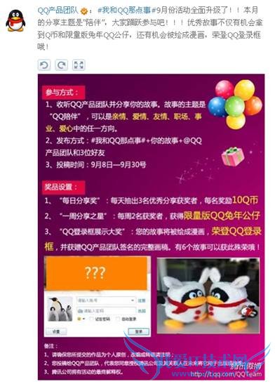 QQ的陪伴各种各样,亲情、友情、爱情、沟通、事业、爱心……此次微博活动将从网友分享的故事中选择有代表意义的素材,由专业的漫画创作团队制作成图画,并于10月份陆续登录QQ登录框,真正做到亿万网友“一起话微博、一起画微博”。而被选中做“主角”的故事当事人,将获得漫画创作团队亲笔签名的完整画稿。