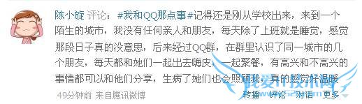 “上班第一件事就是打开QQ,即使离开办公室手机也一直挂着QQ,利用QQ群呼朋引伴结伴出游,在QQ农场等游戏中增进沟通,与相隔各地的亲朋好友维系感情等。” 8日起,一个以 “分享QQ陪伴故事”为主题的活动登录腾讯微博,短短数小时里就人气骤增。