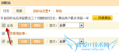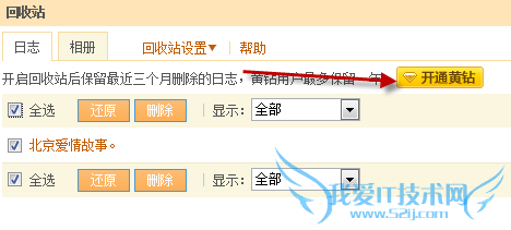 7、如果你是黄钻会员,那么在回收站里看到的说说、日志、相片将是一年内删除的。以后删除说说、日志、相片也会在回收站里保留一年