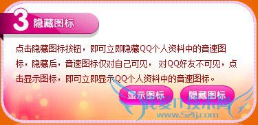 当然如果你需要隐藏你的qq音速图标的话,可以点击如下图所示的“隐藏图标”按钮,即可立即隐藏QQ个人资料中的音速图标,隐藏后,音速图标仅对自己可见, 对QQ好友不可见,点击显示图标,即可立即显示QQ个人资料中的音速图标。