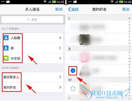 2、出现选择来源,可从人脉圈、群、或者讨论组选择,还可以从最近联系人和我的好友中选择,像小编选择我的好友,出现好友列表,√选好友,点击确定。