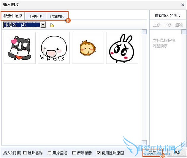 三、您可以从“相册中选择”、“上传照片”、“网络图片”三种方式中任选一种方式上传图片,再点击“确定”;