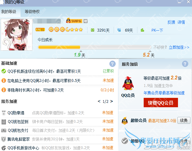 大家可以看到QQ等级加速时长在原来的基础上增加了0.天,也就是说,你以前加速5.0天,现在多出了0.2天,也就是5.2天了!