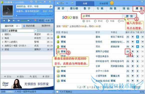在QQ音乐播放器的界面选择搜索=》输入您需要查找的内容后点击搜索=》在搜到的歌曲中找到“”标识的歌曲=》歌曲右边点击试听。(建议试听时看歌曲是否能流畅播放。)