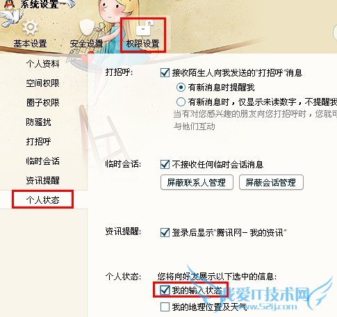 2、在弹出的页面中选择权限设置-个人状态,把我的输入状态前面的勾去掉就取消了。