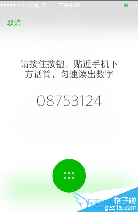 屏幕上会出现8个数字,按要求按住”开始”按钮,贴近手机下方话筒,匀速读出数字