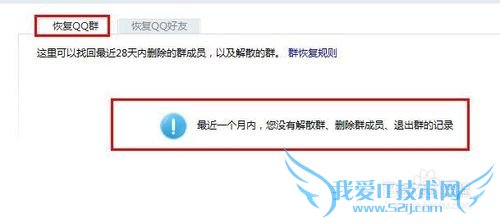 再点击“恢复QQ群”看看,一般QQ最多只能恢复一个月内被删除或解散的QQ群哦。假如没有被删除的QQ群,就会出现如图所示。