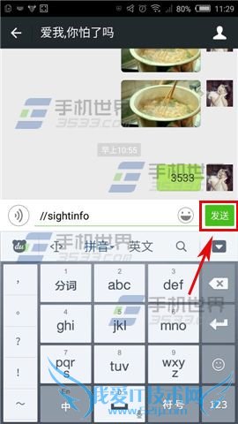 2)输入“//sightinfo”,点击【发送】(PS:发送出去后是看不到代码的,看得到说明没有设置成功),这时你发一个小视频,就能在左上角看到参数啦,需要取消同样发送一次这个代码,退出微信重登即可。(如下图)