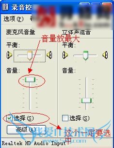 2、在录音控制对话框中,请检查麦克风音量是否选中选择,音量是否调节到最大。