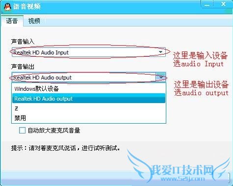 3、如果声音输入和声音输出均是windows默认设备,请展开下拉列表框,请分别选择您的声卡对应的输入和输出设备,当然也要注意下调节mic的音量和音箱、听筒的音量,保存退出,估计对方就可以听见您动听的声音了。