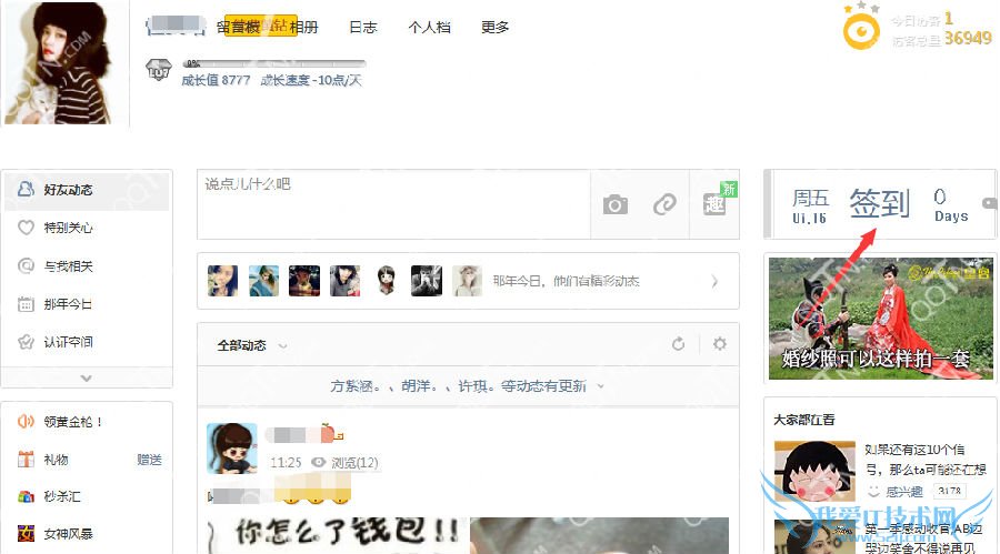 1、进入个人QQ空间以后,在右侧点击签到,如图;