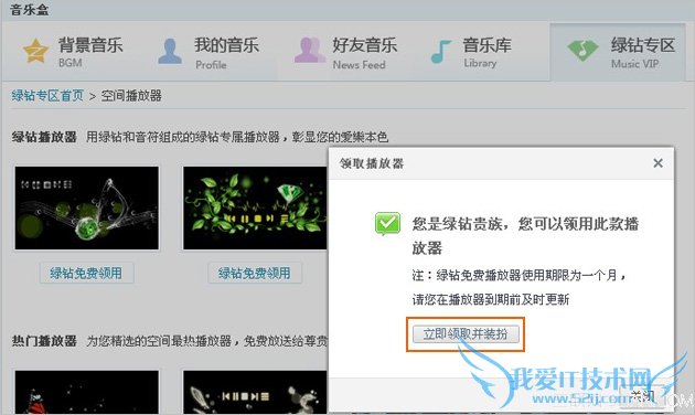 第三步:选定合适的播放器直接点击绿钻免费使用,然后选择立即领取并装扮,空间音乐播放器就会立即显示在空间首页。