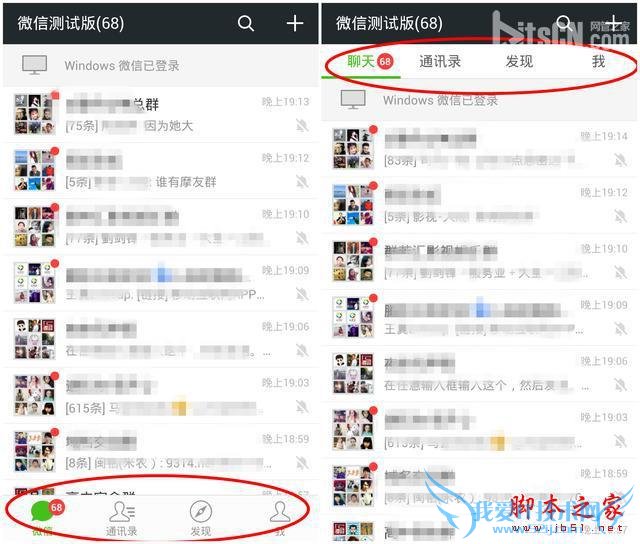 在上左面图片红色圆圈上我们可以看出,微信的主菜单(微信、通讯录、发现、我)在页面底部!下左图片上,我们回发现,主菜单已经到了整个主界面的顶部!整个微信的主界面UI风格有所改变!