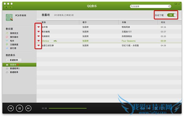 第三步、打开QQ音乐左侧的“我喜欢”目录,下面有刚刚收藏的几个“我喜欢”的歌曲,然后将右上角的“自动下载”打开就一切OK了。当然QQ音乐下载完毕之后你可以尝试一下断开网络看是否可以播放哦!