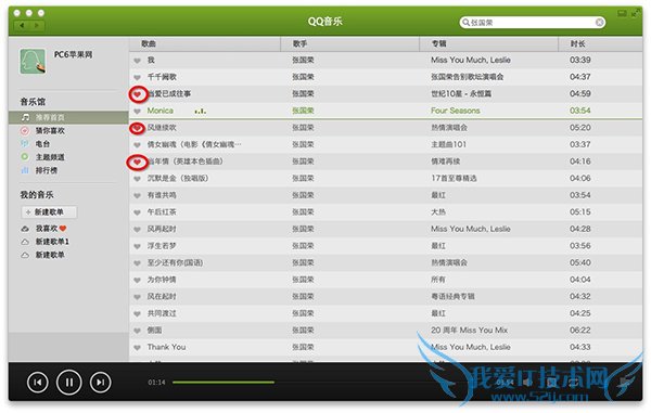 第二步、在搜索栏中搜索你想要下载到本地的歌曲,例如小编喜欢“张国荣”,然后将“当爱已成为往事”、“风继续吹”和“当年情”三首歌曲标记为我喜欢。