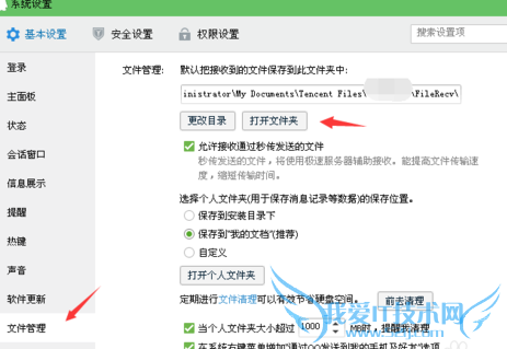 打开系统设置的管理窗后,这里我们找到点选“文件管理”这一选项,然后找到并点击它右侧选项中的“打开文件夹”。