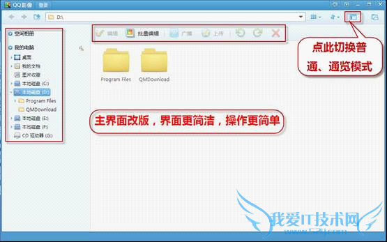 新版QQ影像1.5采用接近Windows资源管理器的管理模式,打开文件后,界面支持以文件夹形式显示排列,结合左侧文件夹树的优化升级,更 富条理性,也更整齐美观。当切换到通览模式时,QQ影像1.5将自动在系统中为用户找出“隐藏”在不同文件夹内的图片,并在界面内排列呈现出来,如果用户 要对整个文件夹或单个图片进行删除、复制等操作,一键切换到普通的浏览模式即可。两种模式随意切换,操作更富人性化!