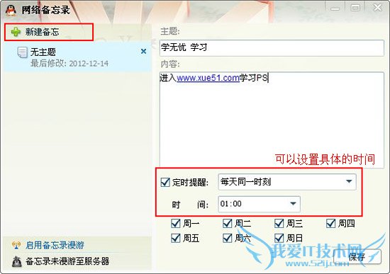 步骤二、然后在弹出的界面中,我们点击新建备忘,然后在右边栏目中输入自己的主题、内容,然后设置具体的时间就可以了,很是方便吧。