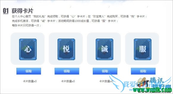 1、在个人中心首页“我的礼包”完成领取,可获得“心”字卡片;在“珍宝商人”完成购买,可获得“悦”字卡片;完成手机激活,可获得“诚”字卡片;活动期间获得1000成长值,可获得“服”字卡片;每张卡片只可获得一次;