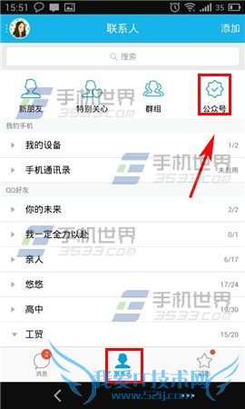 1)打开手机QQ进入应用后点击下方导航栏中【联系人】,接着点击【公众号】。接着找到你要查看历史消息的公众号,点击该公众号进入。(如下图)