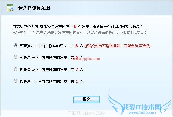 如果你想恢复QQ好友,单击相应的选项系a统就会跳和恢复范围选择,在这里普通用户最多可以恢复3个月内被删除的好友,QQ会员最多可以恢复6个月内被删除的好友。