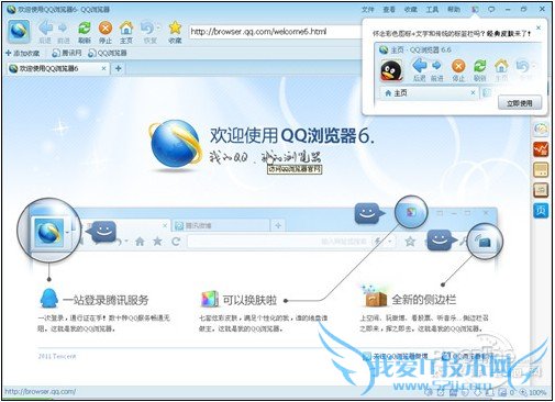 QQ浏览器6.8默认外观风格采用了淡蓝色的色调,给人清新、美观的感觉,标题栏、按纽栏+标签栏的经典界面样式让绝大多数用户都易于接受(如图3)。初始启动时,QQ浏览器主界面会显示推送一些专有功能,让用户了解该版本的特性。在这里非常值得一提的是,从安装时的功能介绍,再到初始启动时候的特性推送,在界面表现上QQ团队都进行了非常精心的制作,从漂亮、卡通且直观的方式将特点介绍给用户,给我们带来非常友好、亲切的感觉。