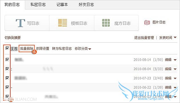 2、全选功能一次最多可以操作一页(15篇)日志。
