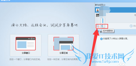 4、接着在我们分享屏幕点击打开之后,看到关于我们分享的屏幕模式的选择,并且出现一个语音分享音量控制的界面。