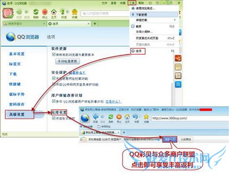 QQ浏览器不仅提供了侧边栏QQ彩贝的快捷入口,而现在QQ浏览器6.9正式版推出了智能的QQ彩贝特权。用户只需要在菜单栏上的“工具”-“选项”进入 “高级设置-应用设置”勾选“开启彩贝特权”。在访问QQ彩贝的合作网站时,会自动登录,并且和用户的QQ帐号绑定,当用户在这些网站购物后,返利直接回馈到用户的QQ帐号,省力又省心。