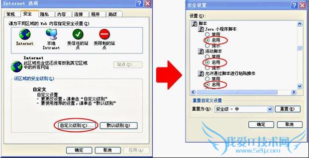 ②、您也可以选择手动设置安全级别。在方法一的基础上,选择左边的按钮“自定义级别”,然后拖动滚动条,找到关于脚本的描述,按下图指示将其启用。
