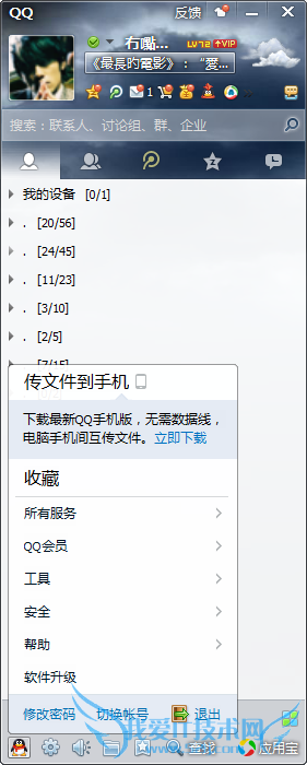主界面,最上方有“QQ”两个大字母,最下方的功能按钮有一点改变,点击QQ图标出现了下面这个全新小窗口
