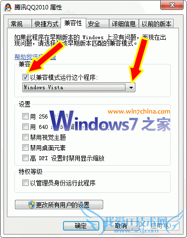 2、在属性窗口里面,点击“兼容性标签”,勾选“以兼容模式运行这个程序”,然后选择“Windows Vista”(如下图),按确定退出。