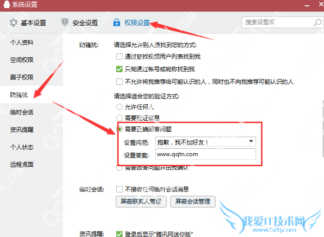 2、在系统设置里,选择权限设置里的防骚扰选项,并选择加好友的要争方式,之前版本的QQ里有可以拒绝任何人加好友的选项,如今最新版本里没有了,我们需要选择的是需要正确回答问题,设置一个让别人完全想象不到的答案就可以了!效果图如下: