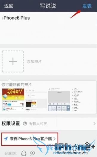 6、这样,位置就变成了来自iPhone6s客户端字样以后,然后就可以点击【发表】。
