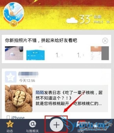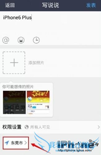 3、在发表说说的时候,在底位会有一个位置比如在东莞,点击这里修改位置成【来自iPhone6s客户端】就可以了。
