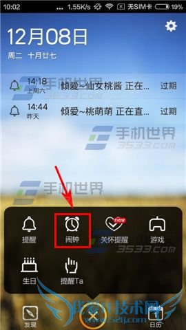 1)打开手机QQ提醒APP进入应用后点击下方导航栏中间【+】,接着点击【闹钟】。(如下图)
