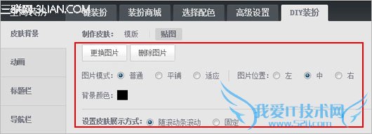 2)上传图片:通过对于本地电脑进行浏览选择您所需要使用照片,(上传的图片将储存在您的贴图相册中,没有则自动生成一个贴图相册,请不要轻易删除,删除该图片或贴图相册后将无法正常展示此自定义皮肤);
