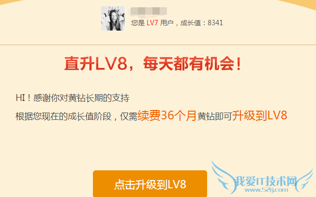 在活动页面登录QQ以后,即可看到系统自动提示你该一次性续费N个月黄钻即可直接升级到LV8,小编成长值太低,竟要续费36个月?!个人建议这个活动只有土豪才能够参与。