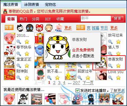 第二步:选中表情,您可以在“最新、热门、分类(包括场景和形象分类)、DIY、收藏、搜索”中选择表情: