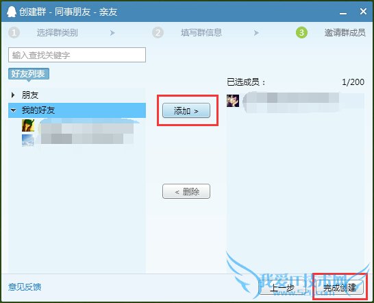 4.在好友列表中选择添加好友,即你需要群发信息的对象。最后选择完成创建即可。