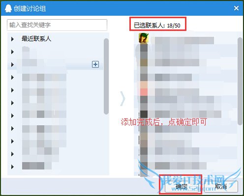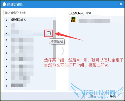 2.在弹出的创建讨论组对话框左侧好友列表里选择好友,也可以直接将某个组的全部好友添加进去。讨论组最多只能选择50人。