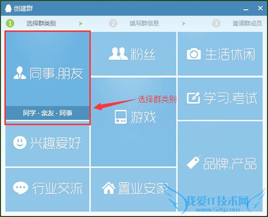 2.在弹出的创建群对话框中选择群类别(本文以同事.朋友为示范)