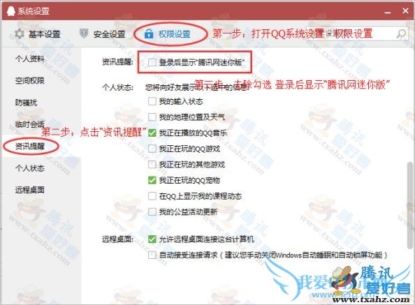 打开QQ系统设置 - 权限设置 - 资讯提醒,去除勾选 登录后显示“腾讯网迷你版”便可。