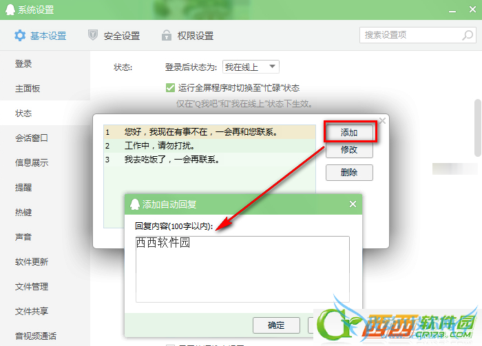 2、在状态和提醒/自动回复选项中,勾选自动回复前面的勾