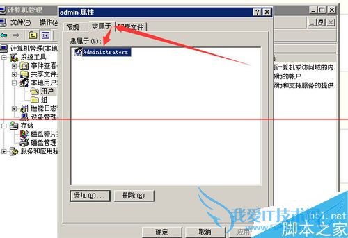 5、最后,在你用户的属性窗口中。点击“隶属于”,在下面,查看自己是否是“administrators”组的成员。如果不是,那么是因为你当前登陆的那个用户没有管理员权限。需要获得管理员权限才能安装QQ。