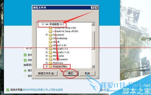 4、在“浏览文件夹”窗口中,我们找一个其它的路径,比如“D:Program Files”。意思就是把默认的安装路径改动一下。选择好后点击“确定”按钮