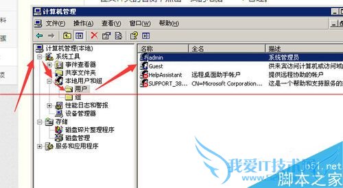 3、我们点开“本地 用户和组”--->"用户",然后在右侧窗口中找到自己当前登陆系统的用户。我的叫“admin”