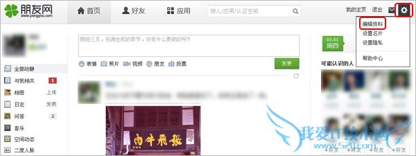 1、进入朋友网首页,点击右上角的“设置--->编辑资料”;