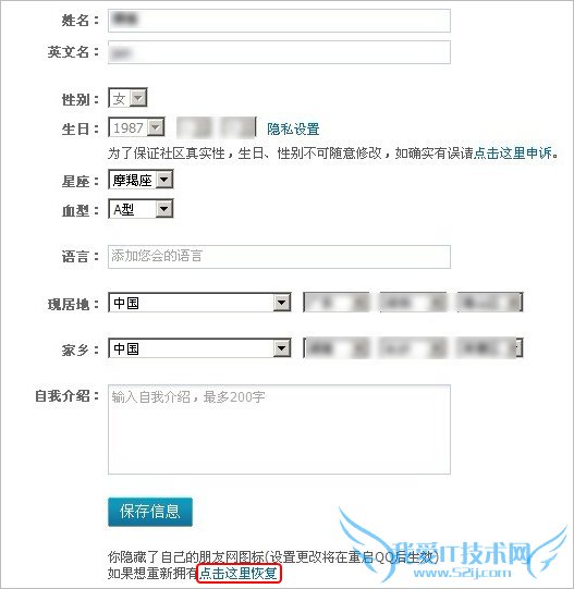 2、在【基本资料】的页面中,点击下方的【点击这里恢复】即可重新点亮朋友网图标。