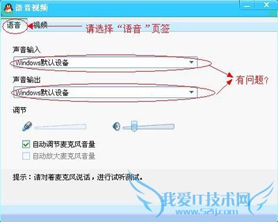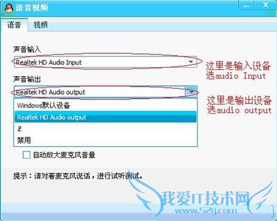 3、如果声音输入和声音输出均是windows默认设备,请展开下拉列表框,请分别选择您的声卡对应的输入和输出设备,当然也要注意下调节mic的音量和音箱、听筒的音量,保存退出,估计对方就可以听见您动听的声音了。